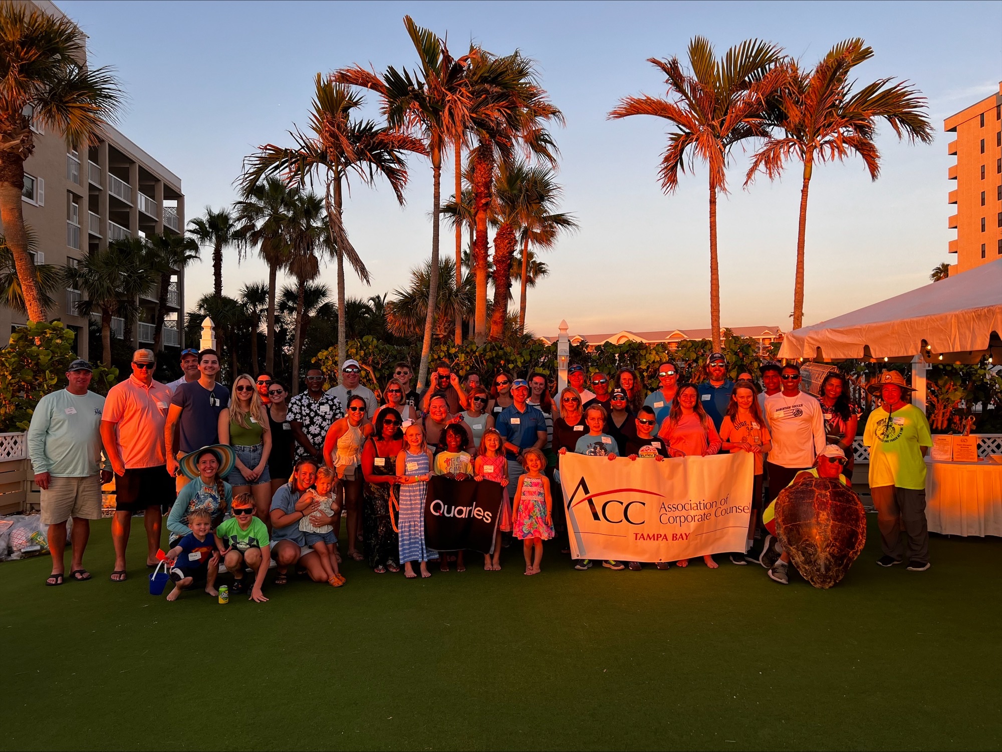 On September 23, 2023 ACC Tampa Bay members and their families partnered with chapter sponsor Quarles & Brady LLP to enjoy a sea turtle and sunset community service event at the TradeWinds Island Grand Resort on St. Pete Beach. Attendees were treated to an engaging presentation about sea turtles and their nesting habits in our area by Sea Turtle Trackers, a local nonprofit whose mission is to assure a suitable habitat for sea turtles, people, and the ecosystem of the islands and surrounding waters of St. Pete Beach and Shell Key Preserve.