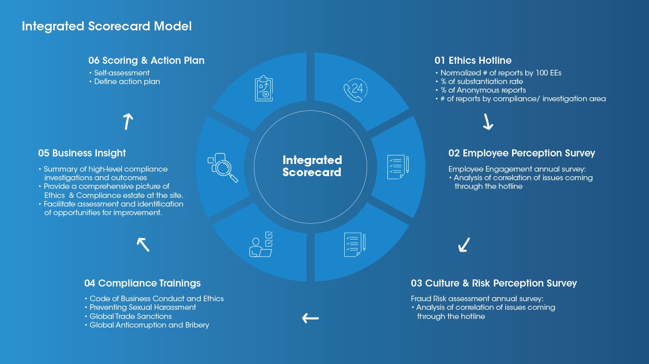The data from the scorecard empowers site leadership with information to create action plans that address potential issues, situations, and hot spots before they become a problem. The scorecard can also help identify misconduct, unethical behavior, and compliance lapses across regions and departments.