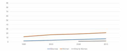 - Lingering inequalities. In law firms, minorities represent 7.5 percent of partners and minority women constitute only 2.5 percent of partners.