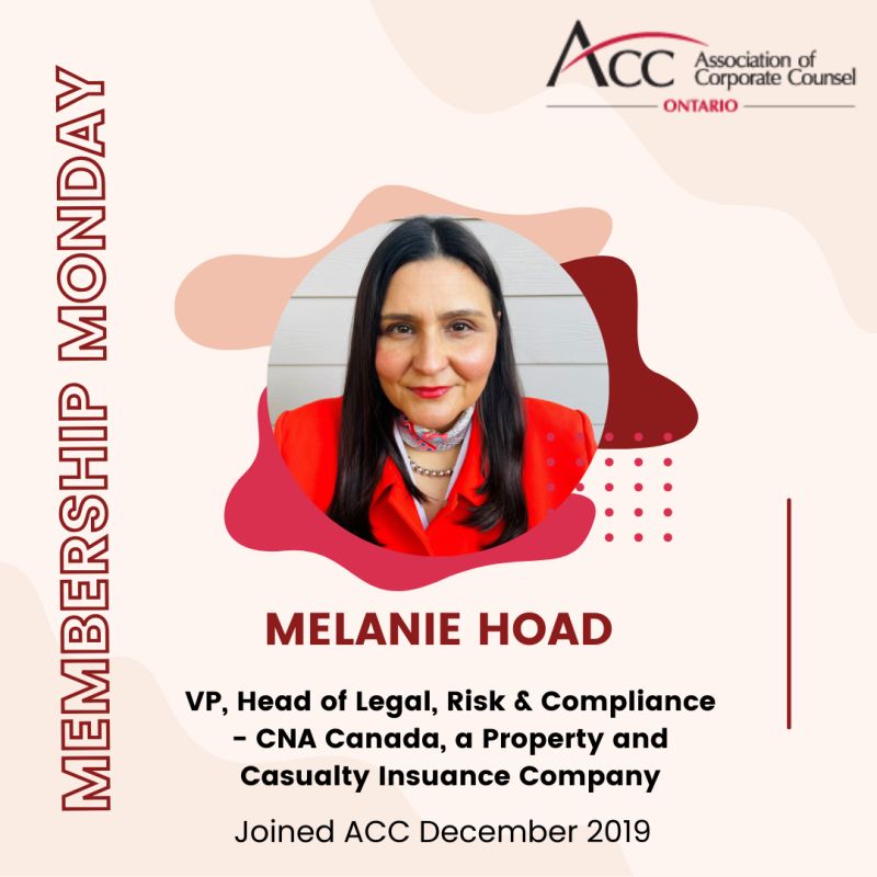 In July 2019, Hoad moved into an in-house corporate counsel role from a predominantly litigation background. She notes that joining ACC Ontario was a strategic move to expand her network of corporate counsel and leverage ACC’s educational courses and legal resources. The networking events and invaluable resources have kept Hoad renewing her membership year after year 🤝.