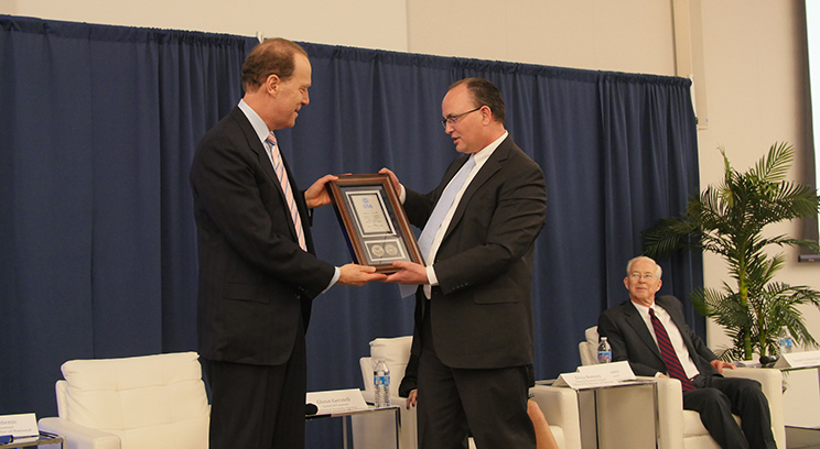 Photo: Glenn Gerstell receives commendation from Daniel Sutherland, chief counsel of DHS’ Cybersecurity & Infrastructure Agency. ©ACC Foundation